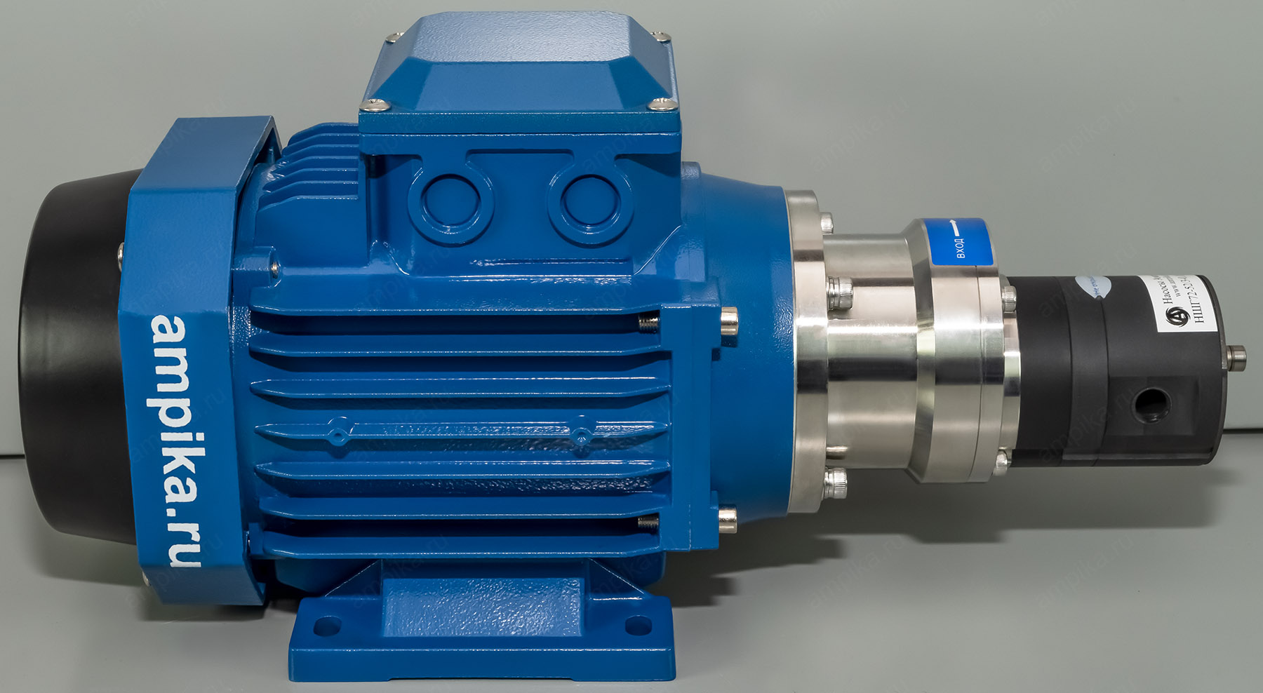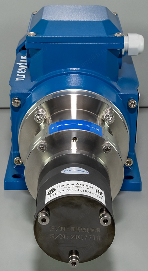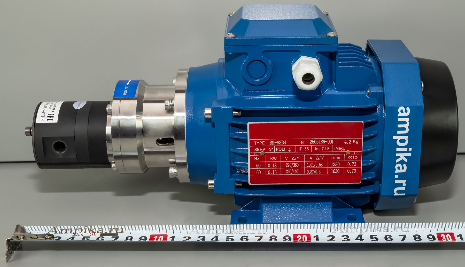 Насос малой производительности Ампика НШГ72-52/3-0,18/4-PTFEМаленький химический шестерённый насос НШГ-72-52/3-0,18/4-PTFE не имеет уплотнения вала, то есть является герметичным, шестерни приводятся магнитной муфтой. Питание: промышленная трёхфазная электросеть на 380 вольт. Насос имеет объёмный принцип работы (перекачивает 0,6 мл жидкости за один оборот вала привода), что позволяет его использовать в качестве дозатора при условии оснащения частотным преобразователем тока и дополнительным вентилятором охлаждения электродвигателя. Замедление скорости вращения мотора может сделать его насосом очень маленькой производительности, что необходимо при регулируемой подаче химических жидкостей в различных производственных процессах. Он предназначен для перекачивания различных жидких химических веществ, не агрессивных к материалам насоса, как например: кислоты (серная, азотная, соляная, фосфорная), щёлочи, растворители, катализатор для фурана (смесь органических и минеральных кислот). При установке взрывозащищённого электродвигателя, насосом возможно перекачивать спирты, растворители и подобные легковоспламеняющиеся жидкости (ЛВЖ). Перекачиваемое вещество не должно содержать абразивных включений. ВНИМАНИЕ!!! При выборе насоса консультируйтесь с продавцом о возможности перекачивания каждого конкретного вещества! Максимальная вязкость перекачиваемой жидкости: 1500 мПа*с. ВНИМАНИЕ!!! При перекачке жидкости с максимальной вязкостью, следует учитывать сопротивление трубопроводов на входе и выходе, а также обороты электродвигателя. Диапазон температуры продукта: от -40˚С до +50˚С. ВНИМАНИЕ!!! Не допускается кристаллизация/полимеризация или застывание перекачиваемой жидкости внутри проточной части. Это может привести к выходу насоса из строя без возможности восстановления. Принцип действия насоса: шестерённый с наружным зацеплением. Материал корпуса насоса - PTFE, вал - из керамики, шестерни - высокопрочный модифицированный PTFE, прокладки корпуса - из FFKM. Конструкция корпуса герметичная, что полностью предотвращает утечки из проточной части. Максимально допустимое давление в корпусе насоса: 6 атм. Максимальная производительность насоса: 3 кубометра в час. Максимальное создаваемое давление: 6 атмосфер. Присоединительные отверстия: внутренняя трубная резьба "одна восьмая дюйма". Расшифровка условного обозначения насоса НШГ72-52/3-0,18/4-PTFE: - «НШГ» – насос шестеренный герметичный, - «72» – типоразмер насосной части, - «52» - максимальная производительность насоса в литрах в час, - «3» - давление насоса в средней рабочей точке в атмосферах, - «0,18» - мощность электродвигателя в киловаттах, - «4» - число полюсов электродвигателя (задаёт скорость вращения вала 1450 оборотов в минуту), - «PTFE» - материал корпуса и шестерён. В таблице характеристик насоса указаны его вес и размеры в упаковочной коробке. Параметры голого насоса: • длина: 315 мм, • ширина: 125 мм, • высота: 150 мм, • вес: 5,4 кг. Паспорт (инструкция по эксплуатации насоса) вложен в его упаковочную коробку. Другие модели этого типа