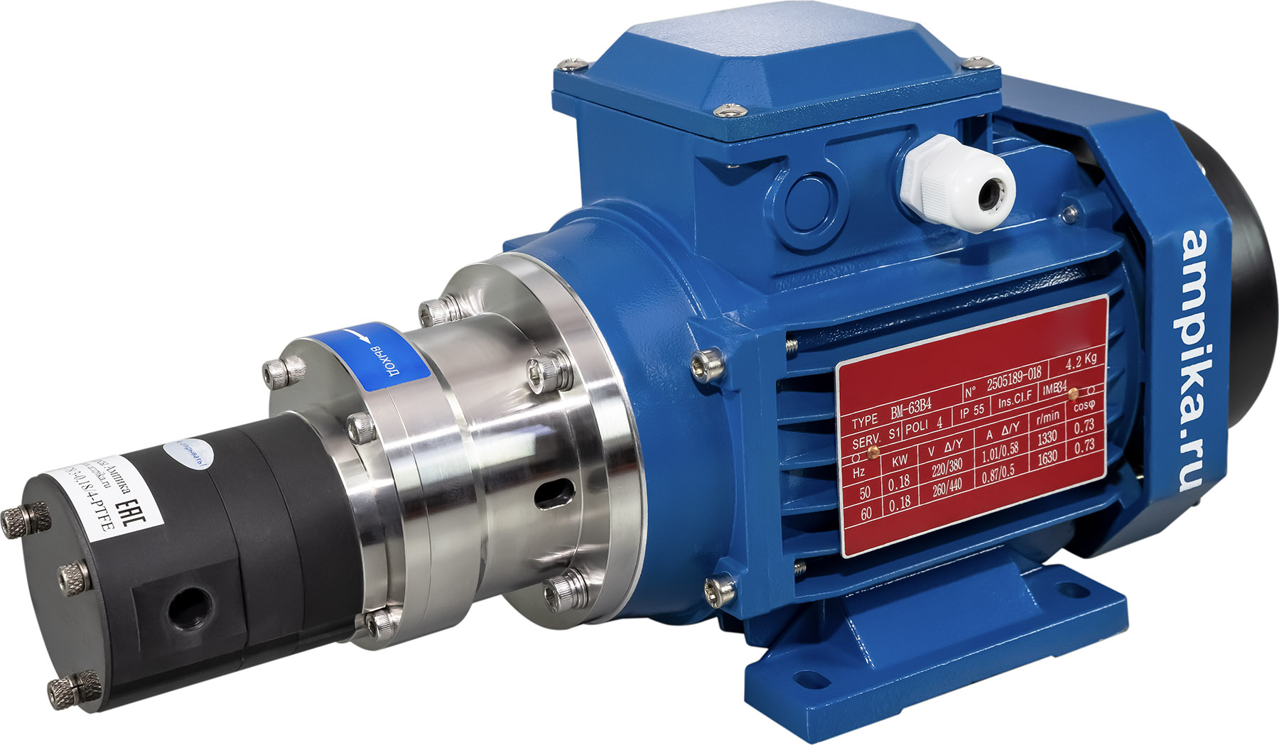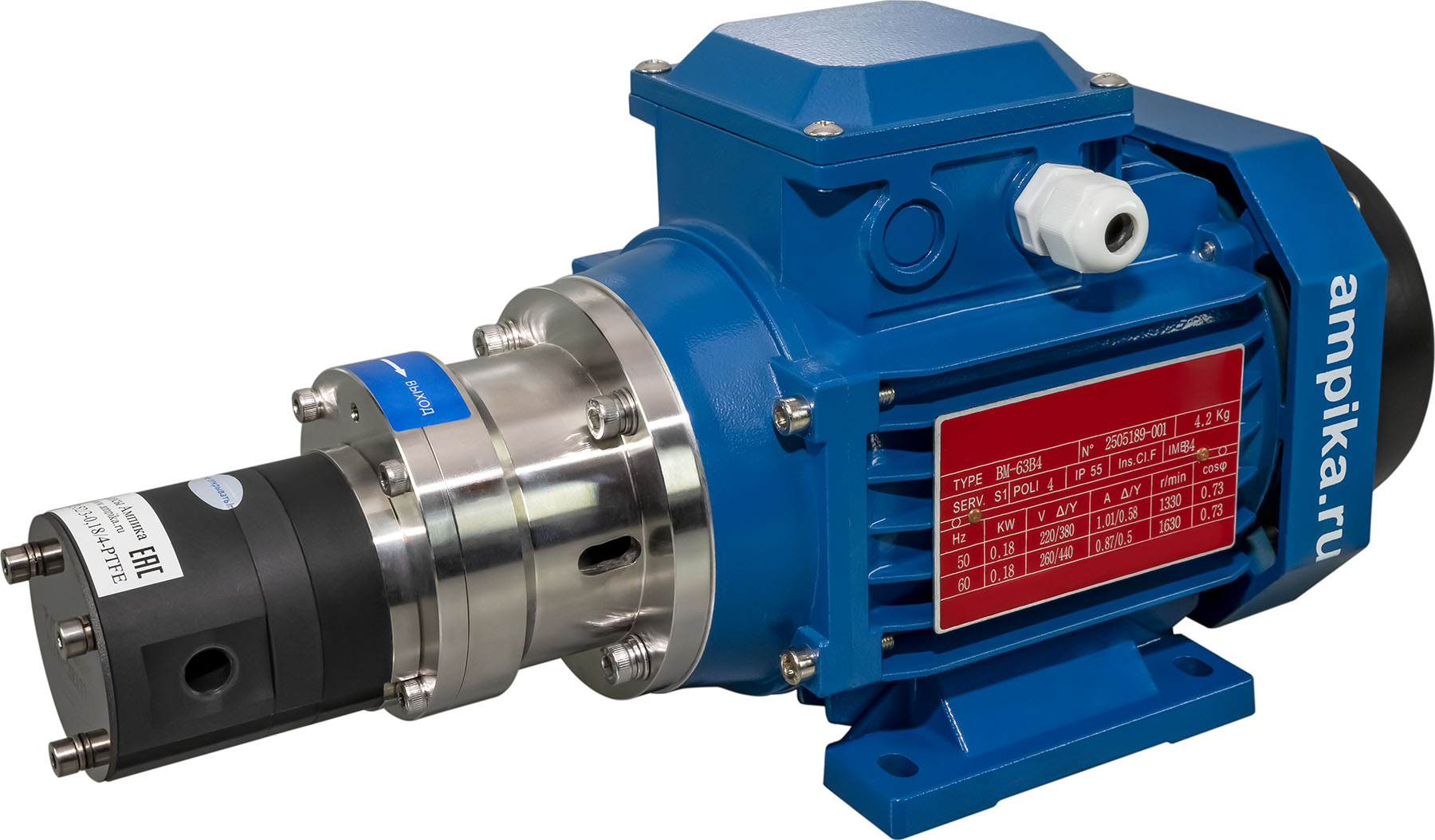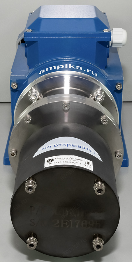 Герметичный химический насос Ампика НШГ115-230/3-0,75/4-PTFEНебольшой химический шестерённый насос НШГ-115-230/3-0,75/4-PTFE не имеет уплотнения вала, то есть является герметичным, шестерни приводятся магнитной муфтой. Питание: промышленная трёхфазная электросеть на 380 вольт, мощность двигателя 750 ватт. Насос имеет объёмный принцип работы, что позволяет его использовать в качестве дозатора при условии оснащения частотным преобразователем тока и дополнительным вентилятором охлаждения электродвигателя. Подача насоса составляет 3 миллилитра жидкости за один оборот двигателя. Замедление скорости вращения мотора может сделать его насосом малой производительности, что необходимо при регулируемой подаче химических жидкостей в различных производственных процессах. Этот насос предназначен для перекачивания различных жидких химических веществ, неагрессивных к материалам его проточной части, например: кислоты (серная, азотная, соляная, фосфорная), щёлочи, растворители, катализатор для фурана (смесь органических и минеральных кислот). При установке взрывозащищённого электродвигателя, насосом возможно перекачивать спирты, растворители и подобные легковоспламеняющиеся жидкости (ЛВЖ). Перекачиваемое вещество не должно содержать абразивных включений. ВНИМАНИЕ!!! При выборе насоса консультируйтесь с продавцом о возможности перекачивания каждого конкретного вещества! Максимальная вязкость перекачиваемой жидкости: 1500 мПа*с. ВНИМАНИЕ!!! При перекачке жидкости с максимальной вязкостью, следует учитывать сопротивление трубопроводов на входе и выходе, а также обороты электродвигателя. Диапазон температуры продукта: от -40˚С до +50˚С. ВНИМАНИЕ!!! Не допускается кристаллизация/полимеризация или застывание перекачиваемой жидкости внутри проточной части. Это может привести к выходу насоса из строя без возможности восстановления. Принцип действия насоса: шестерённый с наружным зацеплением. Материал корпуса насоса - PTFE, вал - из керамики, шестерни - высокопрочный модифицированный PTFE, прокладки корпуса - из FFKM. Конструкция корпуса герметичная, что полностью предотвращает утечки из проточной части. Максимально допустимое давление в корпусе насоса: 8 атм. Максимальная производительность насоса: четверть куба в час. Максимальное создаваемое давление: 8 атмосфер. Присоединительные отверстия: внутренняя трубная резьба "одна вторая дюйма". Расшифровка условного обозначения насоса НШГ115-230/3-0,75/4-PTFE: - «НШГ» – насос шестеренный герметичный, - «115» – диаметр насосной части, - «230» - максимальная производительность насоса в литрах в час, - «3» - давление насоса в средней рабочей точке в атмосферах, - «0,75» - мощность электродвигателя в киловаттах, - «4» - число полюсов электродвигателя (задаёт скорость вращения вала 1450 оборотов в минуту), - «PTFE» - материал корпуса и шестерён. В таблице характеристик насоса указаны его вес и размеры в упаковочной коробке. Параметры голого насоса: • длина: 400 мм, • ширина: 160 мм, • высота: 185 мм, • вес: 13,2 кг. Паспорт (инструкция по эксплуатации насоса) вложен в его упаковочную коробку. Другие модели этого типа