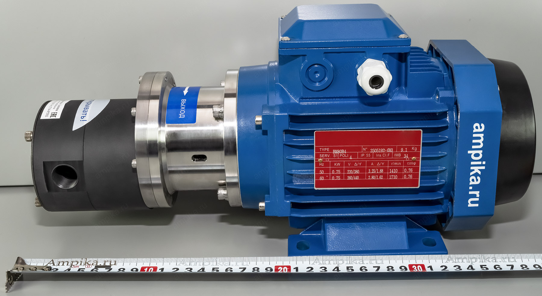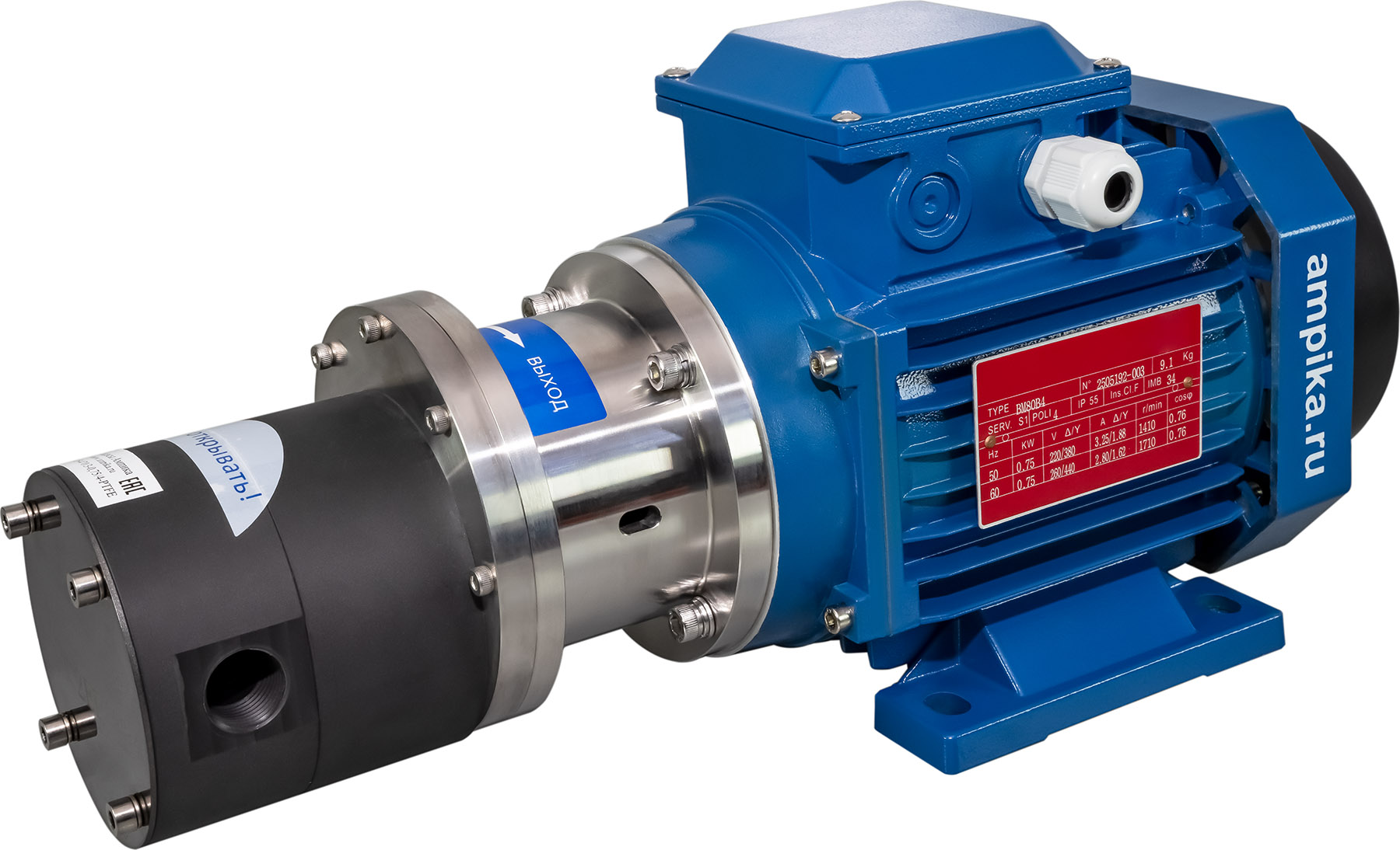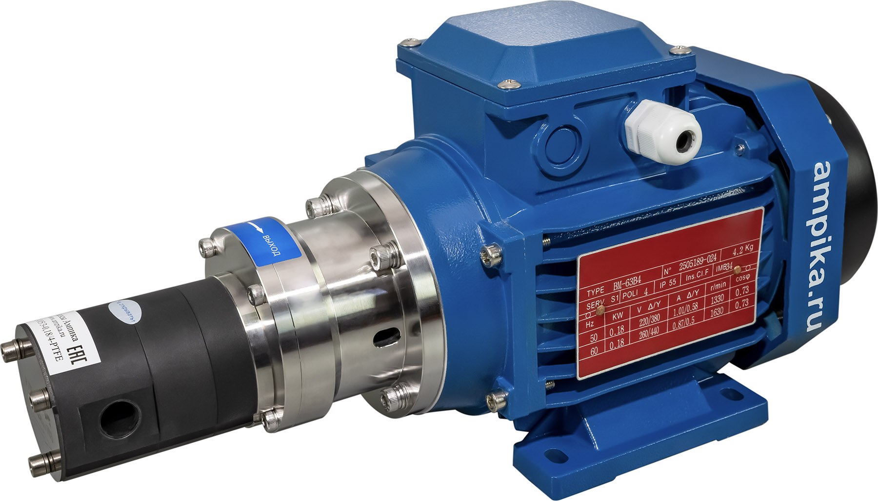 Герметичный химический насос Ампика НШГ115-230/3-0,75/4-PTFEНебольшой химический шестерённый насос НШГ-115-230/3-0,75/4-PTFE не имеет уплотнения вала, то есть является герметичным, шестерни приводятся магнитной муфтой. Питание: промышленная трёхфазная электросеть на 380 вольт, мощность двигателя 750 ватт. Насос имеет объёмный принцип работы, что позволяет его использовать в качестве дозатора при условии оснащения частотным преобразователем тока и дополнительным вентилятором охлаждения электродвигателя. Подача насоса составляет 3 миллилитра жидкости за один оборот двигателя. Замедление скорости вращения мотора может сделать его насосом малой производительности, что необходимо при регулируемой подаче химических жидкостей в различных производственных процессах. Этот насос предназначен для перекачивания различных жидких химических веществ, неагрессивных к материалам его проточной части, например: кислоты (серная, азотная, соляная, фосфорная), щёлочи, растворители, катализатор для фурана (смесь органических и минеральных кислот). При установке взрывозащищённого электродвигателя, насосом возможно перекачивать спирты, растворители и подобные легковоспламеняющиеся жидкости (ЛВЖ). Перекачиваемое вещество не должно содержать абразивных включений. ВНИМАНИЕ!!! При выборе насоса консультируйтесь с продавцом о возможности перекачивания каждого конкретного вещества! Максимальная вязкость перекачиваемой жидкости: 1500 мПа*с. ВНИМАНИЕ!!! При перекачке жидкости с максимальной вязкостью, следует учитывать сопротивление трубопроводов на входе и выходе, а также обороты электродвигателя. Диапазон температуры продукта: от -40˚С до +50˚С. ВНИМАНИЕ!!! Не допускается кристаллизация/полимеризация или застывание перекачиваемой жидкости внутри проточной части. Это может привести к выходу насоса из строя без возможности восстановления. Принцип действия насоса: шестерённый с наружным зацеплением. Материал корпуса насоса - PTFE, вал - из керамики, шестерни - высокопрочный модифицированный PTFE, прокладки корпуса - из FFKM. Конструкция корпуса герметичная, что полностью предотвращает утечки из проточной части. Максимально допустимое давление в корпусе насоса: 8 атм. Максимальная производительность насоса: четверть куба в час. Максимальное создаваемое давление: 8 атмосфер. Присоединительные отверстия: внутренняя трубная резьба "одна вторая дюйма". Расшифровка условного обозначения насоса НШГ115-230/3-0,75/4-PTFE: - «НШГ» – насос шестеренный герметичный, - «115» – диаметр насосной части, - «230» - максимальная производительность насоса в литрах в час, - «3» - давление насоса в средней рабочей точке в атмосферах, - «0,75» - мощность электродвигателя в киловаттах, - «4» - число полюсов электродвигателя (задаёт скорость вращения вала 1450 оборотов в минуту), - «PTFE» - материал корпуса и шестерён. В таблице характеристик насоса указаны его вес и размеры в упаковочной коробке. Параметры голого насоса: • длина: 400 мм, • ширина: 160 мм, • высота: 185 мм, • вес: 13,2 кг. Паспорт (инструкция по эксплуатации насоса) вложен в его упаковочную коробку. Другие модели этого типа