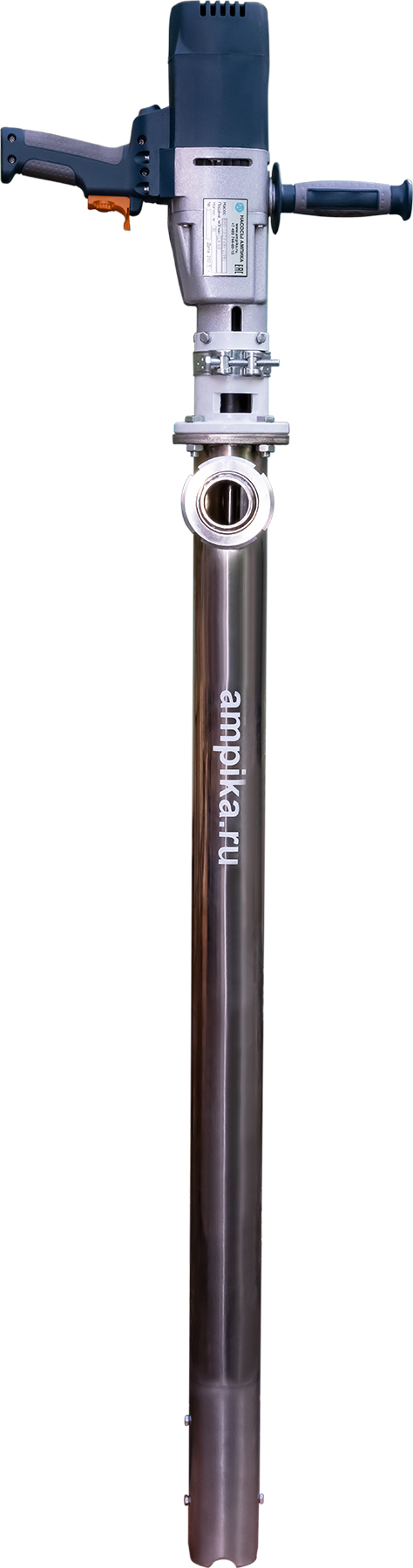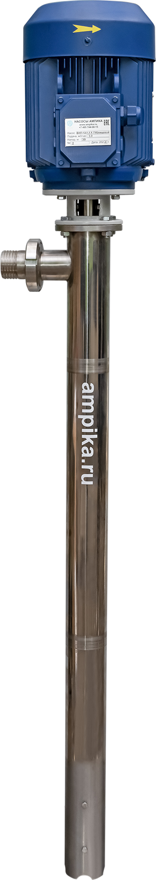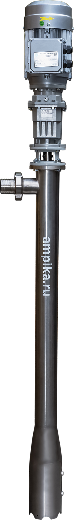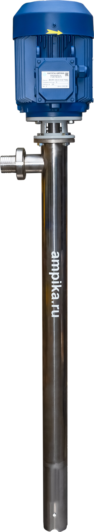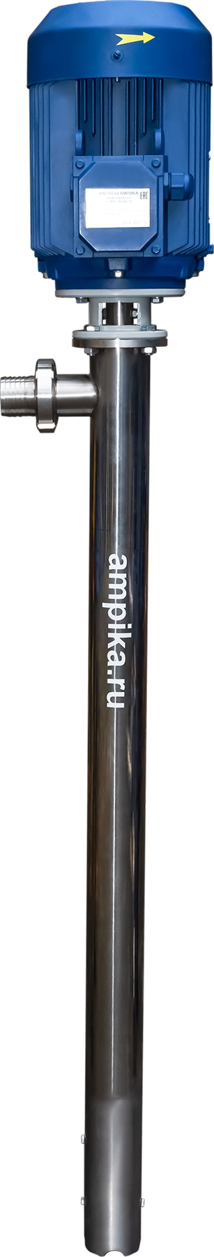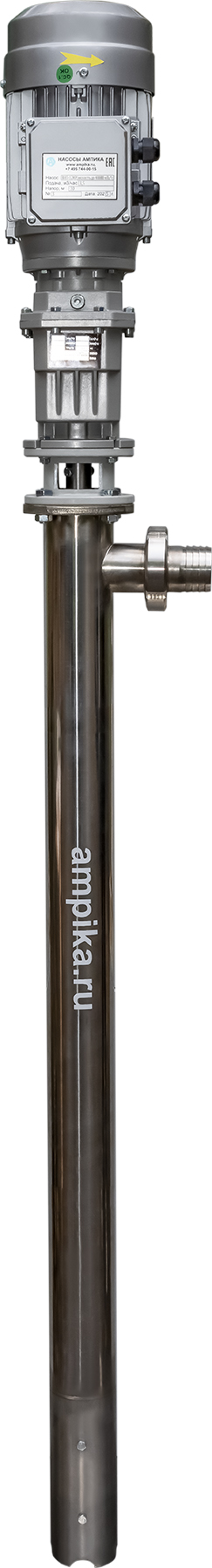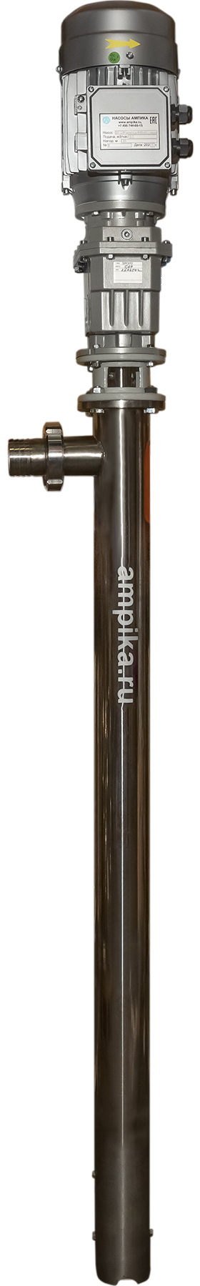 Винтовой бочковой насос Ампика ВНП-12 (2,2х1000) пищевойМощный промышленный электрический бочковой насос винтового принципа действия ВНП-12 (2,2х1000) предназначен для выкачивания жидких пищевых продуктов из бочек ёмкостью 200 л, 60 л, фляг (глубина погружения - до 1200 мм). Наружный диаметр погружной части - 76 мм, это следует учитывать, не в каждую горловину бочки он войдёт. Выходной патрубок с ёлочкой под шланг внутренним диаметром 50 мм, крепится к корпусу насоса через молочную муфту, что позволяет быстро отсоединять шланг при необходимости. Насос называется полупогружной потому, что верхняя часть (электродвигатель) всегда над ёмкостью. Прорези внизу трубы насосной части - для прохода жидкости к героторной паре винт-обойма. Этот насос может использоваться для перекачки таких жидкостей, как например: пищевые масла, концентраты соков, майонез, сметана, мед, фруктовые пюре, некоторые щелочные жидкости и прочие продукты средней вязкости, химически не агрессивные к материалам насоса. По окончании работы винтовой насос можно промывать дезрастворами с концентрацией 1-2%. В стандартном исполнении эта модель комплектуется статором из белой пищевой резины NBR (25-25-563) и уплотнением вала из EPDM. ВНИМАНИЕ! Насос НЕ ПРЕДНАЗНАЧЕН!!! для полиэфирных смол, отвердителей, кислот, щелочей, растворителей!!! Уточняйте возможность его работы с каждой конкретной жидкостью у специалистов по подбору насосов Ампики!!! При этом надо учитывать не только перекачиваемую, но и промывочную жидкость. Пищевой бочковой винтовой насос марки ВНП-12 подаёт до 7 кубометров продукта в час с напором 40 метров (то есть создаёт давление 4 атмосферы). Данные предоставлены для жидкостей, схожих по своим характеристикам с водой. Производительность насоса напрямую связана с вязкостью жидкости, длиной и диаметром трубопровода: чем труднее насосу качать, тем меньше будет подача. Технические характеристики: • Максимальная вязкость перекачиваемой жидкости - 10000 мПа*с. • Размер пропускаемых частиц - до 5 мм, не более 10% по объёму. • Материал корпуса проточной части (трубы) и внутренних деталей (винт, торсион, наконечник вала э/д, фланец под торцевое уплотнение): нержавеющая сталь марки AISI304. • Уплотнение вала торцевое, с парой трения из карбида кремния и эластомером из EPDM. Возможна установка уплотнения из витона. • Материал обоймы: белая пищевая резина 25-52-563 (NBR). Также возможна установка обойм из: - полиуретана, - витона (фторкаучука), - износостойкой чёрной МБС резины 7-В-14. • Максимальная глубина погружения - 1,2 м (возможно изготовление с глубиной погружения до 2 м под заказ). • Наружный диаметр трубы погружной части: 76 мм. • Выход насоса – молочная муфта Ду50 DIN 11851 со штуцером под шланг Ду 50 мм. • Электродвигатель: общепромышленный, трёхфазный, асинхронный, на 380 вольт, IP54, с возможностью постоянной работы. Возможна комплектация электродвигателем во взрывозащищённом исполнении. Другие модели этого типа