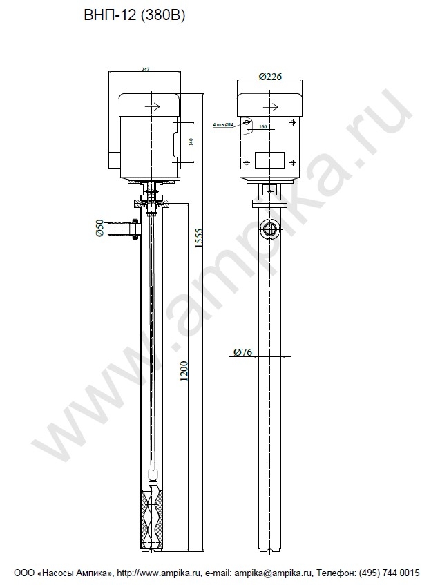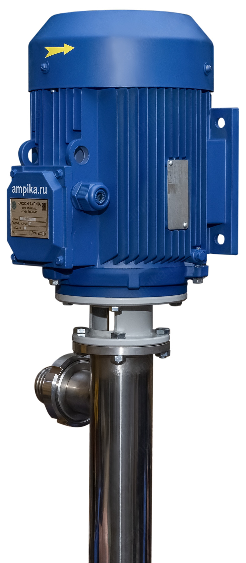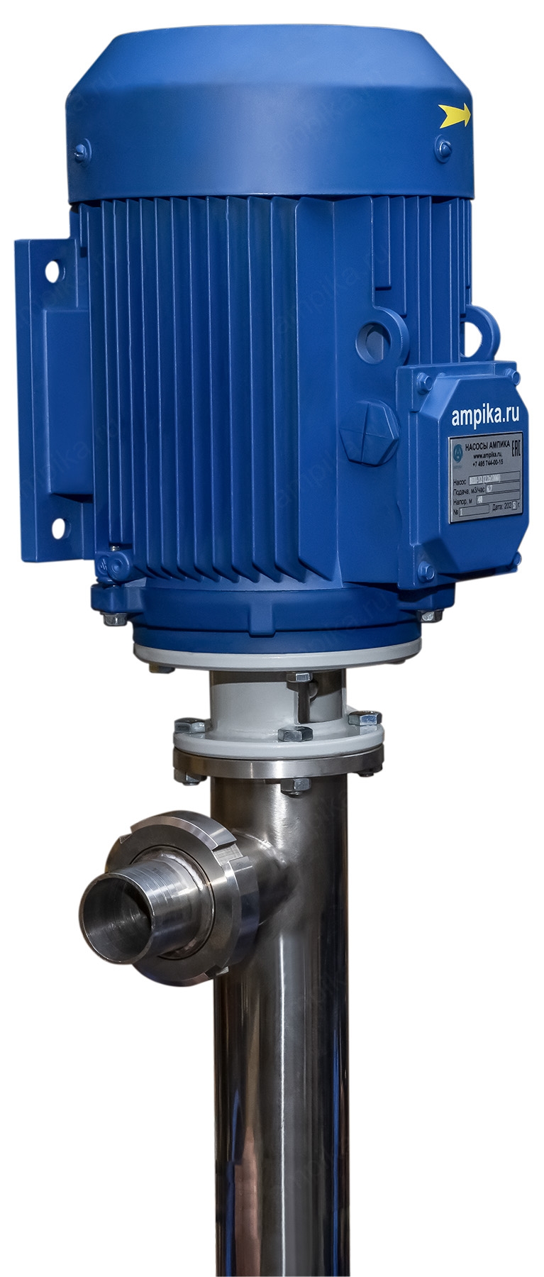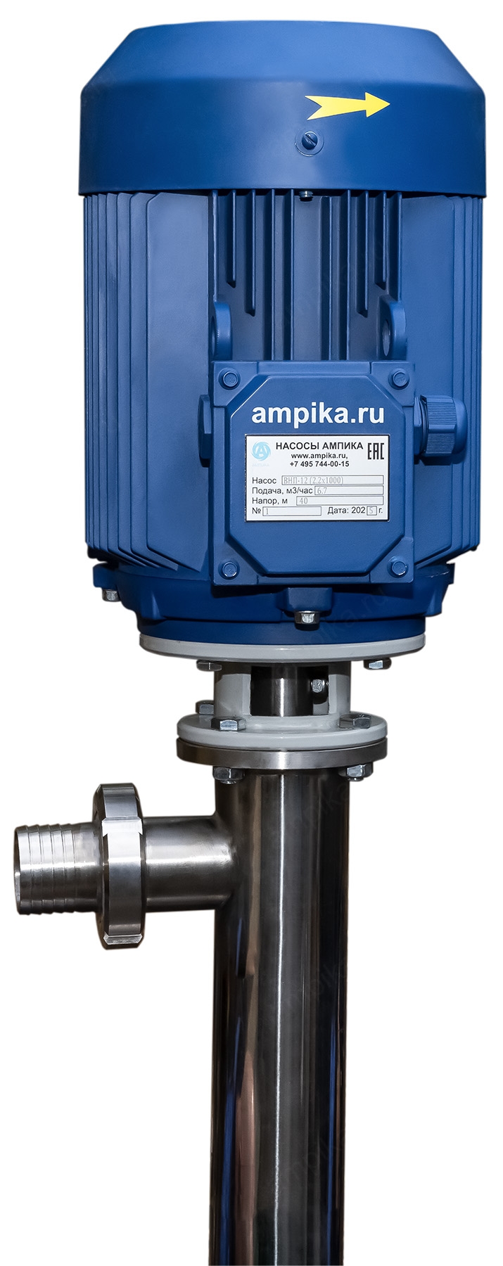 Винтовой бочковой насос Ампика ВНП-12 (2,2х1000) пищевойМощный промышленный электрический бочковой насос винтового принципа действия ВНП-12 (2,2х1000) предназначен для выкачивания жидких пищевых продуктов из бочек ёмкостью 200 л, 60 л, фляг (глубина погружения - до 1200 мм). Наружный диаметр погружной части - 76 мм, это следует учитывать, не в каждую горловину бочки он войдёт. Выходной патрубок с ёлочкой под шланг внутренним диаметром 50 мм, крепится к корпусу насоса через молочную муфту, что позволяет быстро отсоединять шланг при необходимости. Насос называется полупогружной потому, что верхняя часть (электродвигатель) всегда над ёмкостью. Прорези внизу трубы насосной части - для прохода жидкости к героторной паре винт-обойма. Этот насос может использоваться для перекачки таких жидкостей, как например: пищевые масла, концентраты соков, майонез, сметана, мед, фруктовые пюре, некоторые щелочные жидкости и прочие продукты средней вязкости, химически не агрессивные к материалам насоса. По окончании работы винтовой насос можно промывать дезрастворами с концентрацией 1-2%. В стандартном исполнении эта модель комплектуется статором из белой пищевой резины NBR (25-25-563) и уплотнением вала из EPDM. ВНИМАНИЕ! Насос НЕ ПРЕДНАЗНАЧЕН!!! для полиэфирных смол, отвердителей, кислот, щелочей, растворителей!!! Уточняйте возможность его работы с каждой конкретной жидкостью у специалистов по подбору насосов Ампики!!! При этом надо учитывать не только перекачиваемую, но и промывочную жидкость. Пищевой бочковой винтовой насос марки ВНП-12 подаёт до 7 кубометров продукта в час с напором 40 метров (то есть создаёт давление 4 атмосферы). Данные предоставлены для жидкостей, схожих по своим характеристикам с водой. Производительность насоса напрямую связана с вязкостью жидкости, длиной и диаметром трубопровода: чем труднее насосу качать, тем меньше будет подача. Технические характеристики: • Максимальная вязкость перекачиваемой жидкости - 10000 мПа*с. • Размер пропускаемых частиц - до 5 мм, не более 10% по объёму. • Материал корпуса проточной части (трубы) и внутренних деталей (винт, торсион, наконечник вала э/д, фланец под торцевое уплотнение): нержавеющая сталь марки AISI304. • Уплотнение вала торцевое, с парой трения из карбида кремния и эластомером из EPDM. Возможна установка уплотнения из витона. • Материал обоймы: белая пищевая резина 25-52-563 (NBR). Также возможна установка обойм из: - полиуретана, - витона (фторкаучука), - износостойкой чёрной МБС резины 7-В-14. • Максимальная глубина погружения - 1,2 м (возможно изготовление с глубиной погружения до 2 м под заказ). • Наружный диаметр трубы погружной части: 76 мм. • Выход насоса – молочная муфта Ду50 DIN 11851 со штуцером под шланг Ду 50 мм. • Электродвигатель: общепромышленный, трёхфазный, асинхронный, на 380 вольт, IP54, с возможностью постоянной работы. Возможна комплектация электродвигателем во взрывозащищённом исполнении. Другие модели этого типа