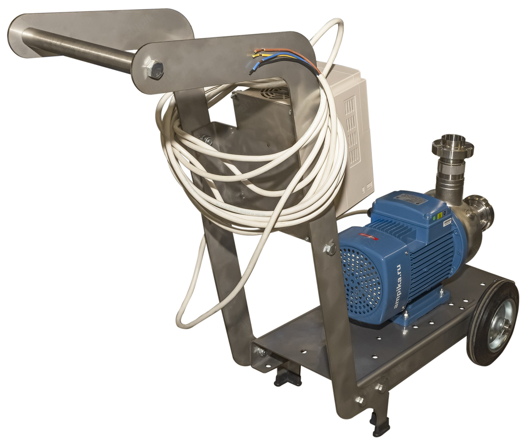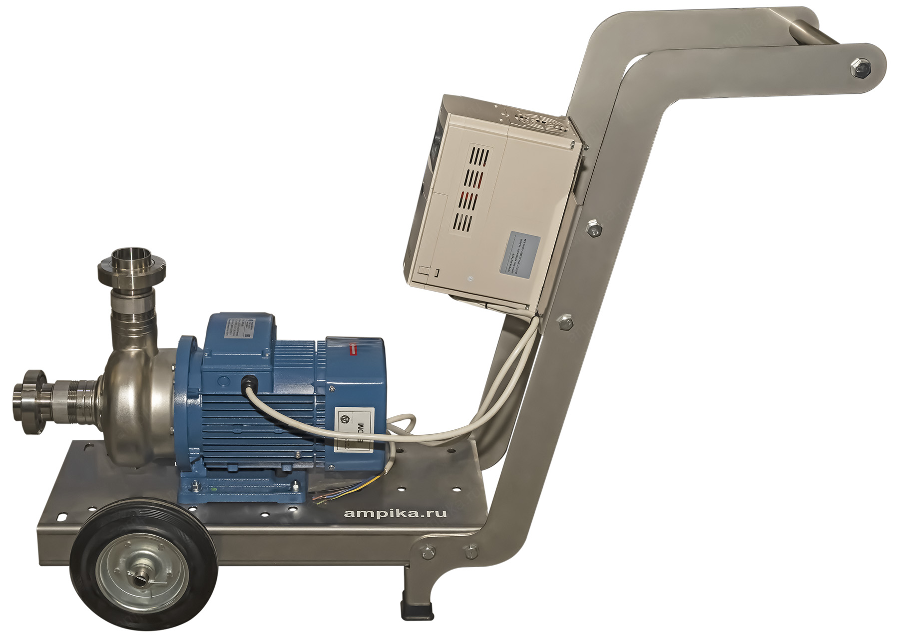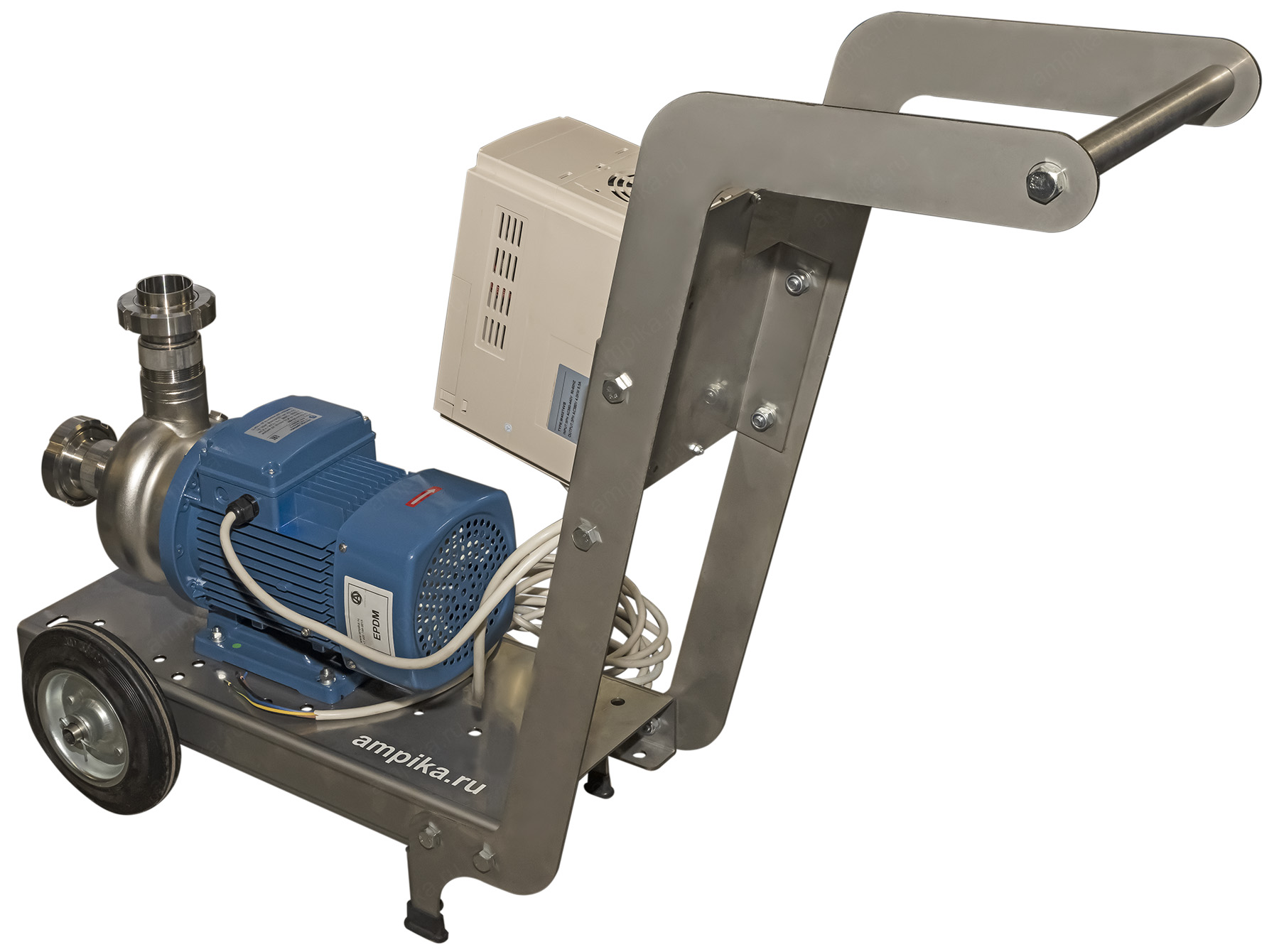 Промышленный пищевой насос Ампика ОНЦ-20-20 на тележке с частотным регуляторомПередвижная насосная установка переменной производительности для перекачки жидких пищевых продуктов на базе популярного промышленного центробежного насоса ОНЦ-20/20 на 380 вольт. Этапы сборки агрегата: • У пищевого насоса ОНЦ заменили уплотнение и прокладку корпуса на щёлочестойкую резину EPDM (это нужно для устойчивости к промывочным дезрастворам). • На всасывающий и нагнетательный патрубки накрутили штуцеры с молочными гайками под приварку. • Установили насос на тележку из нержавеющей стали. • На неё же смонтировали частотный регулятор (для регулирования производительности насоса). • Соединили насос с частотником и добавили 10 метров питающего кабеля. Перечень компонентов - во вкладке Запчасти. Стандартный срок изготовления подобного агрегата - 3 рабочих дня. Транспортные параметры насосной установки в сборе: • длина: 1050 мм, • ширина: 420 мм, • высота: 830 мм, • вес: 42 кг. |