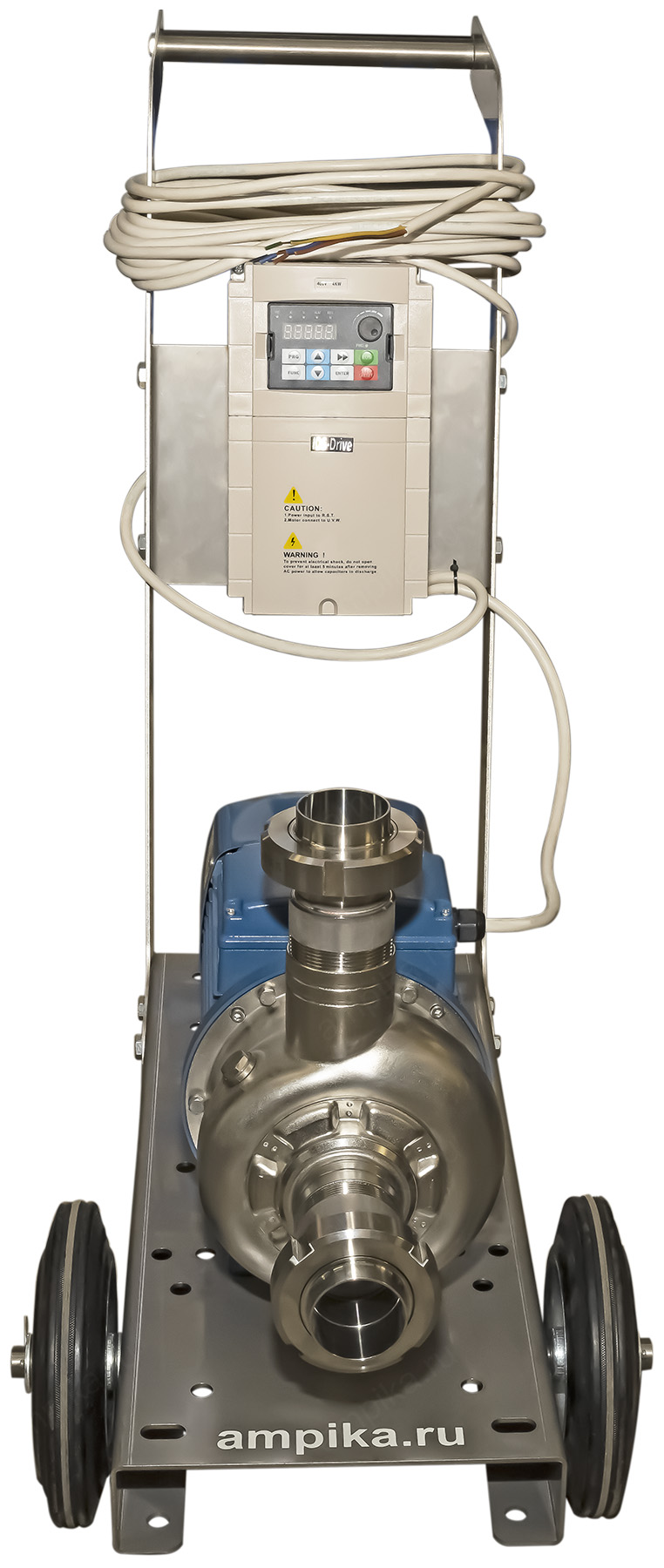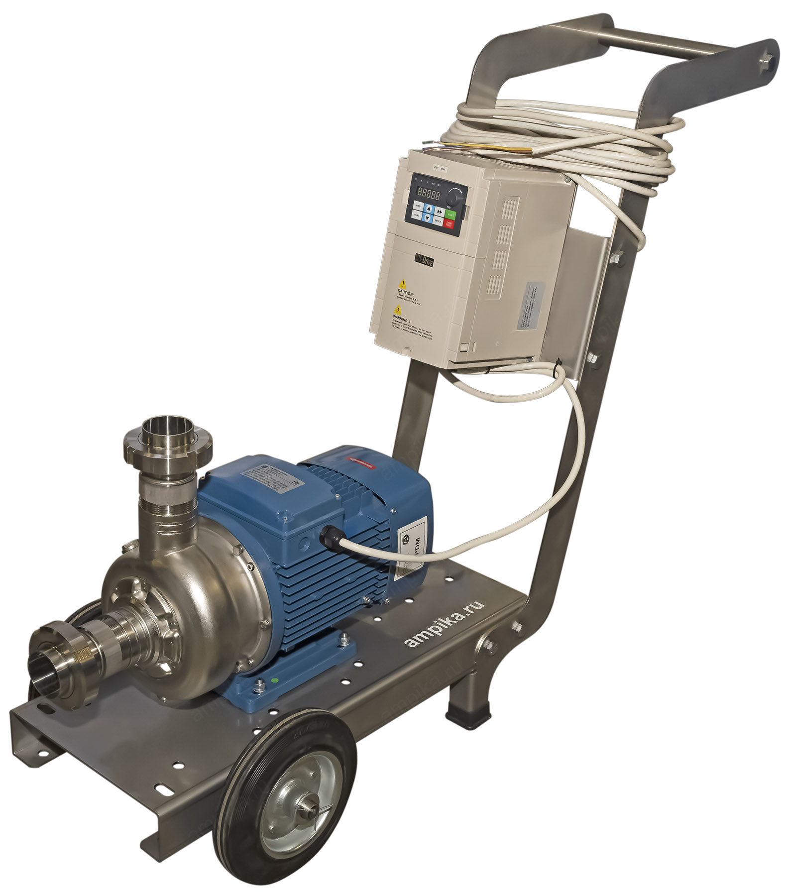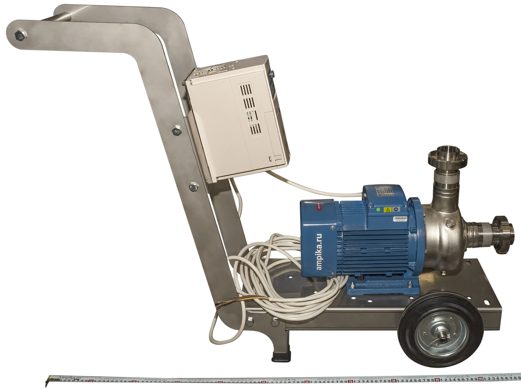Промышленный пищевой насос Ампика ОНЦ-20-20 на тележке с частотным регуляторомПередвижная насосная установка переменной производительности для перекачки жидких пищевых продуктов на базе популярного промышленного центробежного насоса ОНЦ-20/20 на 380 вольт. Этапы сборки агрегата: • У пищевого насоса ОНЦ заменили уплотнение и прокладку корпуса на щёлочестойкую резину EPDM (это нужно для устойчивости к промывочным дезрастворам). • На всасывающий и нагнетательный патрубки накрутили штуцеры с молочными гайками под приварку. • Установили насос на тележку из нержавеющей стали. • На неё же смонтировали частотный регулятор (для регулирования производительности насоса). • Соединили насос с частотником и добавили 10 метров питающего кабеля. Перечень компонентов - во вкладке Запчасти. Стандартный срок изготовления подобного агрегата - 3 рабочих дня. Транспортные параметры насосной установки в сборе: • длина: 1050 мм, • ширина: 420 мм, • высота: 830 мм, • вес: 42 кг. |