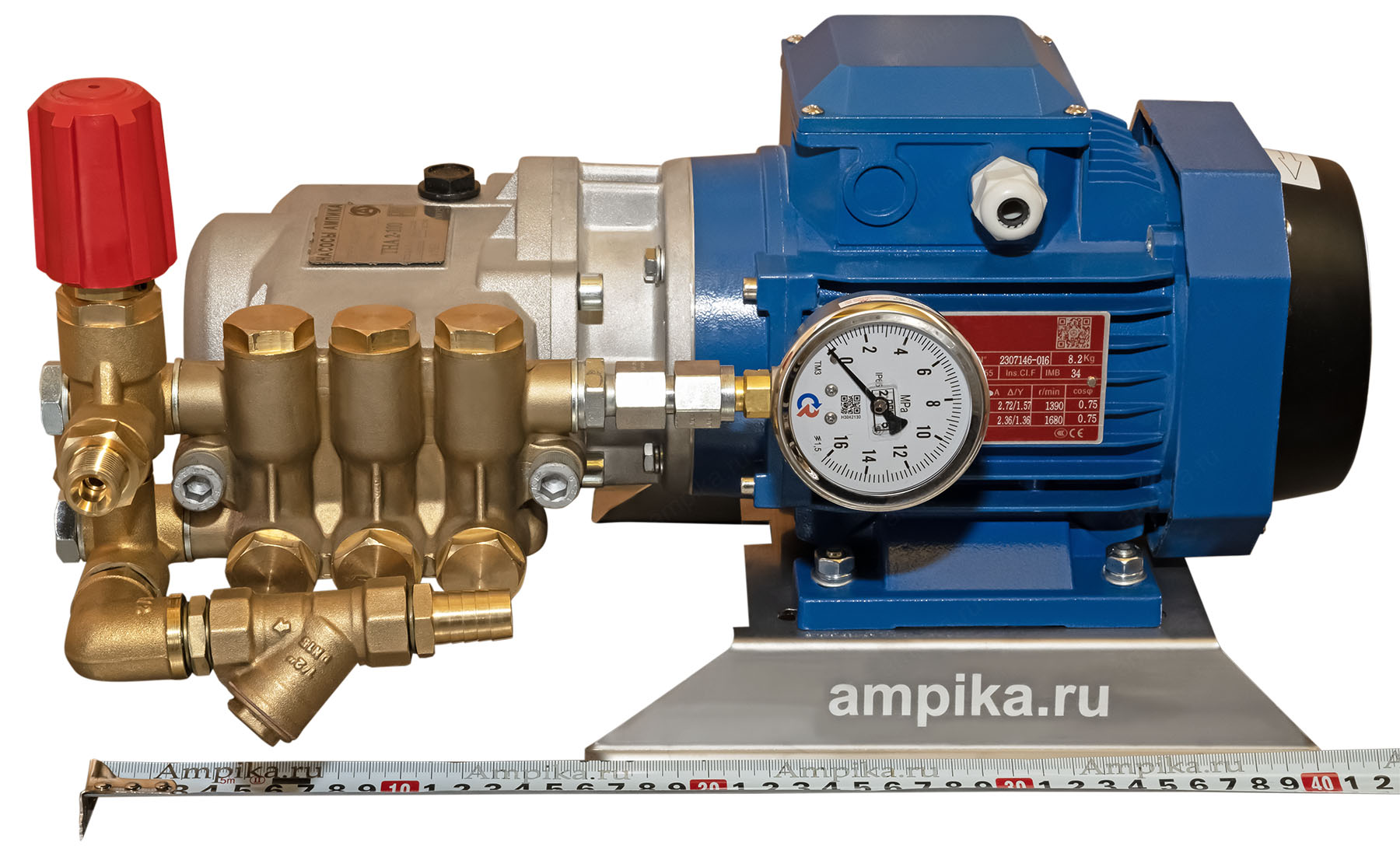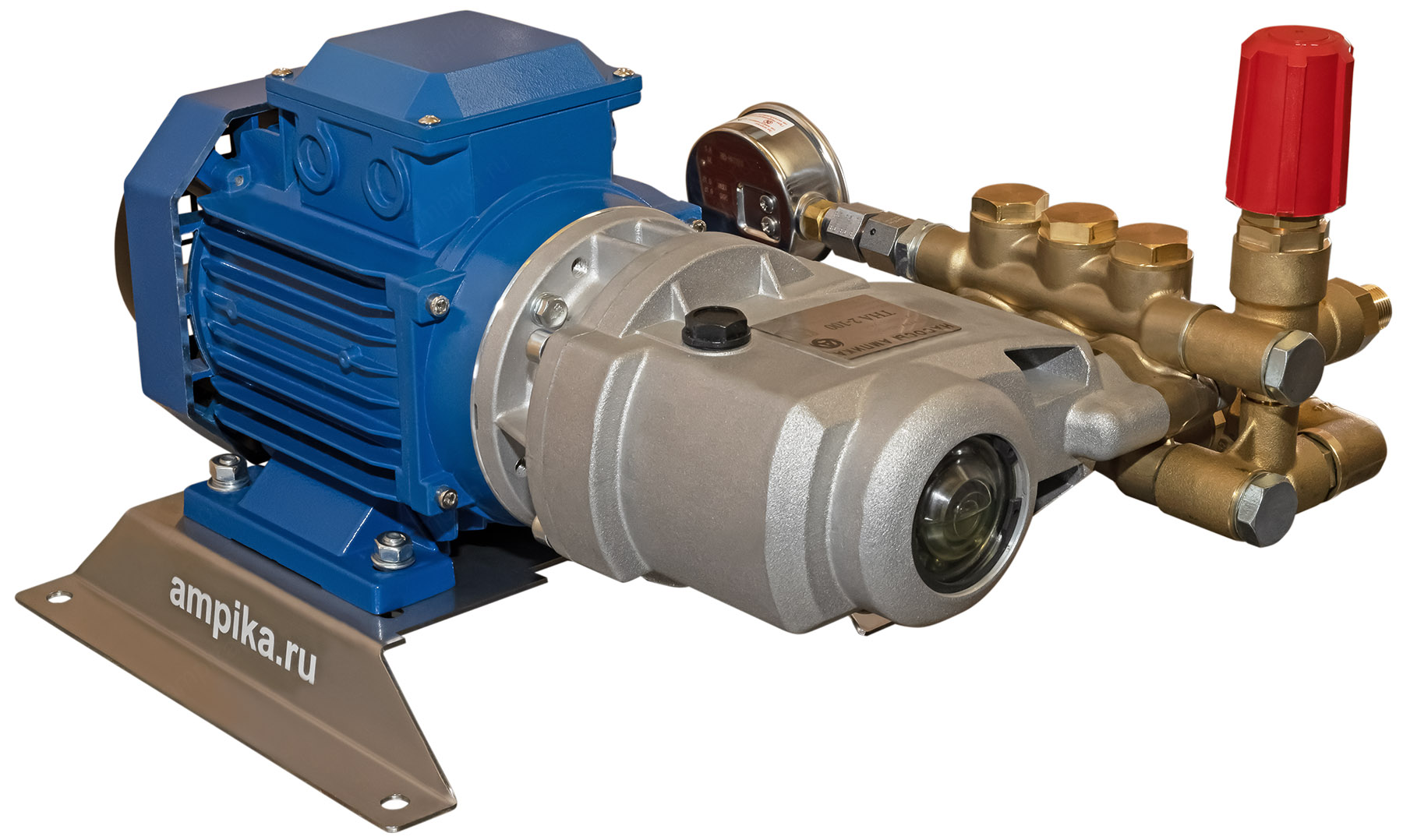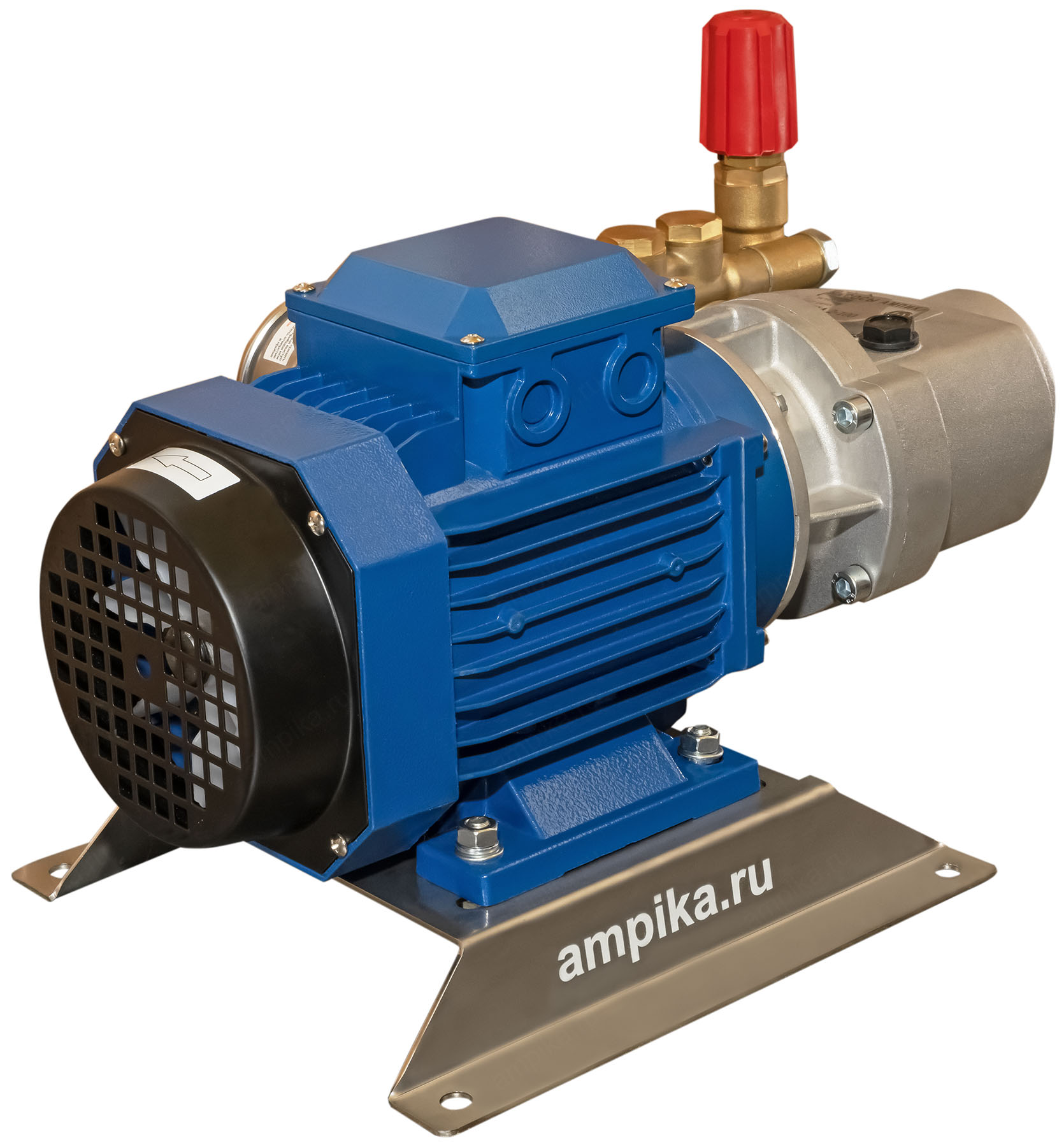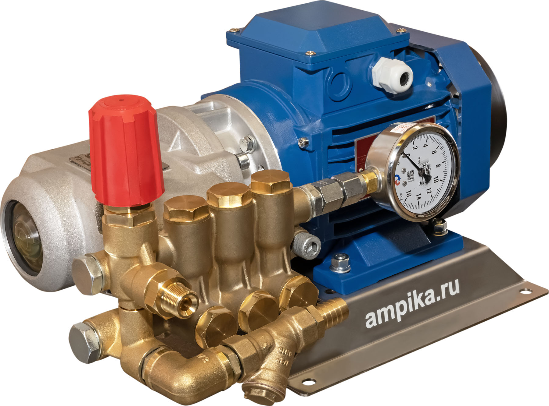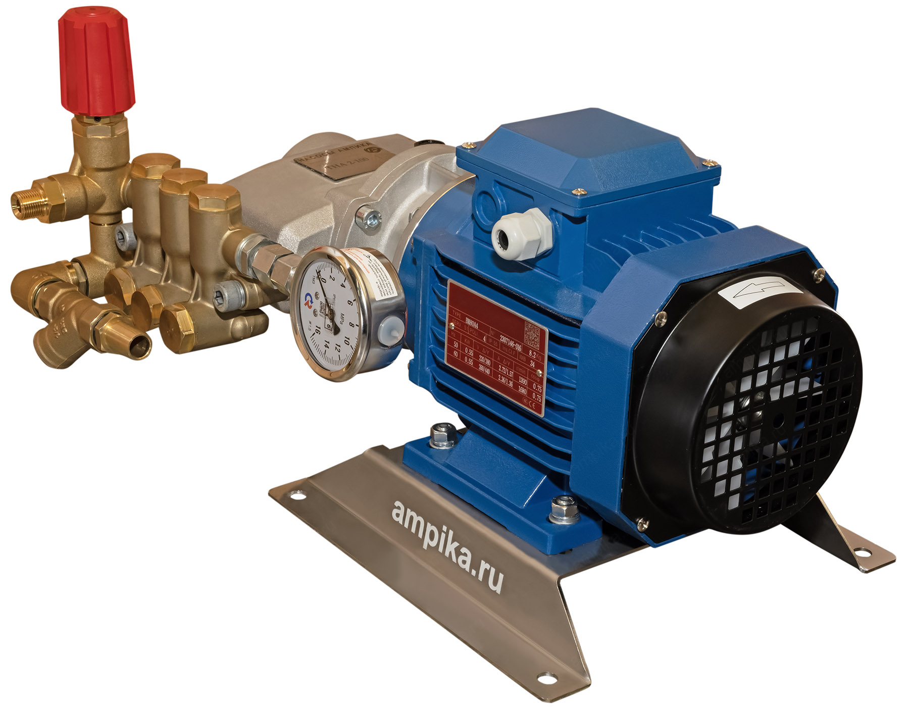 Трёхплунжерный насос Ампика ТНА 2-100 (380В)Маленький трёхфазный высоконапорный насос ТНА-2-100 представляет собой моноблочный насосный агрегат на базе трёхплунжерного насоса итальянского производства. Компактный и относительно лёгкий насос большого давления питается от бытовой розетки, создавая напор в 100 атмосфер. Этот насос может применяться для распыления воды под высоким давлением в системах туманообразования, в качестве напорного насоса для маленькой технологической мойки высокого давления, для привода гидроагрегатов и т.п. Насос укомплектован перепускным клапаном (байпасом) для регулировки максимального давления, манометром с поверкой (с возможностью быстрого съёма) и сетчатым фильтром на всасывании. На входе установлен штуцер под шланг внутренним диаметром 16 мм. Подача насоса: 120 литров в час. Рабочая температура жидкости: до +65ºC. Электродвигатель общепромышленный трёхфазный, на 380 вольт, мощностью 550 ватт, степень защиты - IP55. |