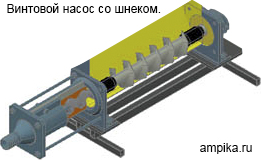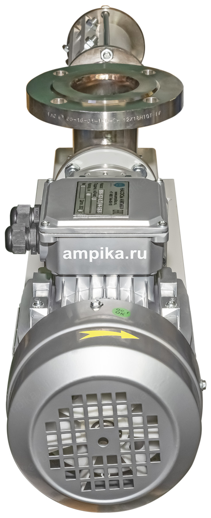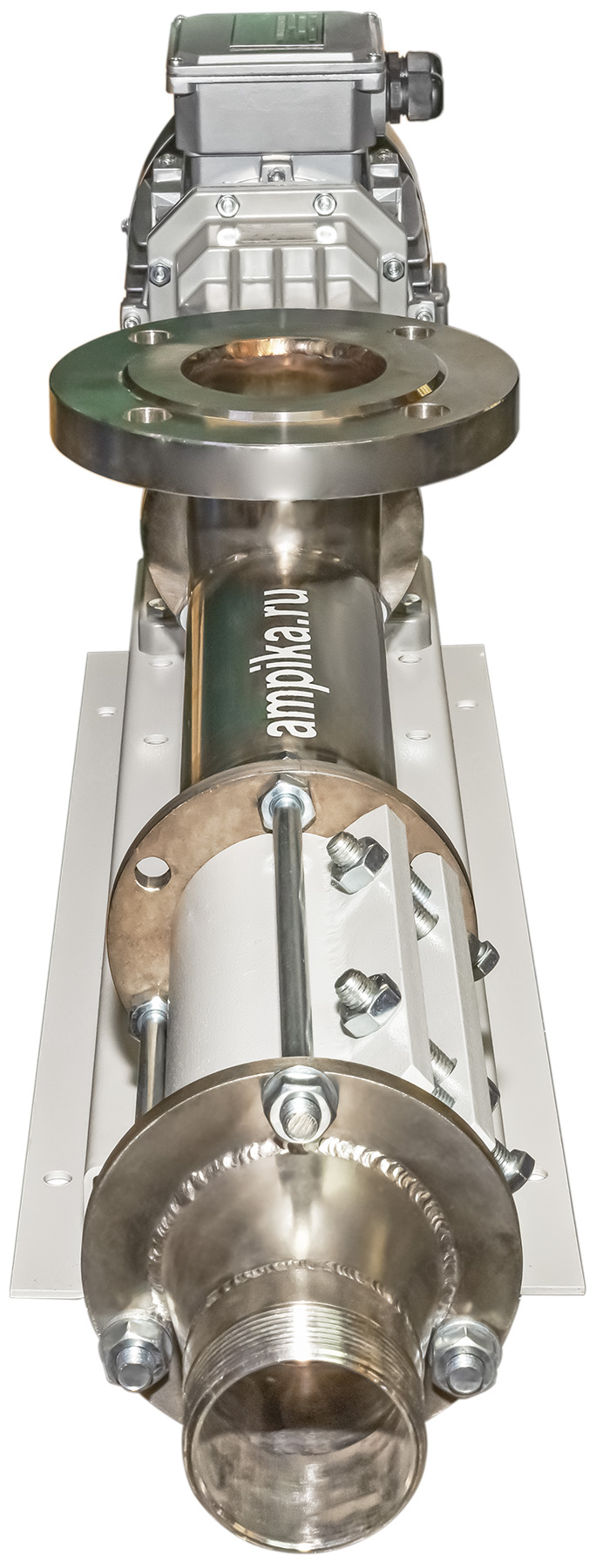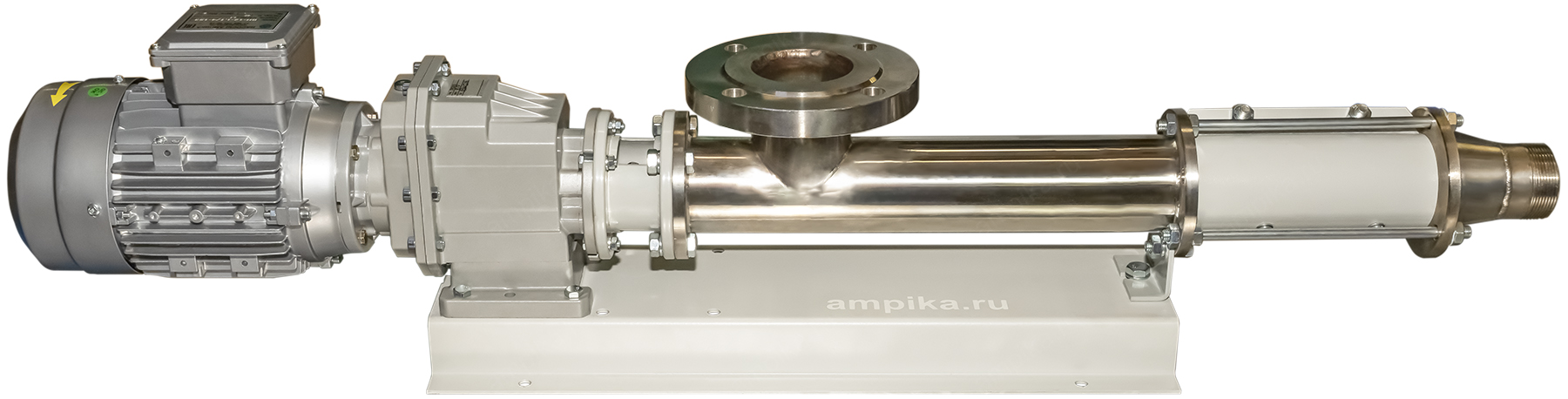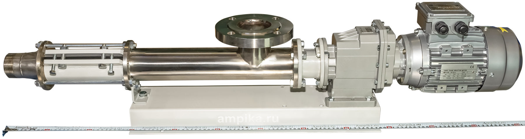 ВН-12-1,1/4-153 (со шнеком, Ду65 на входе, на выходе - наружная резьба 2``)Винтовой насос ВН-12-1,1/4-153 предназначен для перекачивания жидких и пастообразных сред, в том числе абразивных суспензий высокой вязкости, таких как: меласса, патока, масла, флокулянты, ПАВы (например, лаутресульфат натрия), ил, и подобных. Возможна перекачка продуктов с частицами до 5 мм. Температура перекачиваемой жидкости до +90ºC. Проточная часть изготовлена из нержавеющей стали 12Х18Н10Т, статор из МБС резины или полиуретана, уплотнение вала - торцевое (витон или EPDM). Винт, торсион - сталь 40Х13. Карданы обрезиненные, с БРС из стали. Преимуществом данных насосов является возможность бережной перекачки продукта, без изменений структуры. Насос укомплектованы мотор-редукторами, что обеспечивает пониженные обороты ротора и высокий крутящий момент. Это позволяет сильно повысить ресурс работы героторной пары и перекачивать вязкие жидкости. В данном конкретном насосе, изготовленным под заказ, по индивидуальным требованиям заказчика, установлен шнековый питатель, что улучшает затекание жидкостей, которые имеют пониженную текучесть. По умолчанию насосы изготавливаются без шнека. Расшифровка условного обозначения марки насоса ВН-12-1,1/4-153: - ВН - винтовой насос, - 12 - типоразмер героторной пары (0,12 л/оборот винта), - 1,1 - производительность насоса в м³/час (на воде), - 4 - давление насоса на воде, атм., - 153 - обороты ротора. По индивидуальному заказу на входе в насос (сверху) установлен фланец с диаметром условного прохода 65 мм, а на выходе (спереди) - наружная трубная резьба "два дюйма". Другие модели этого типа